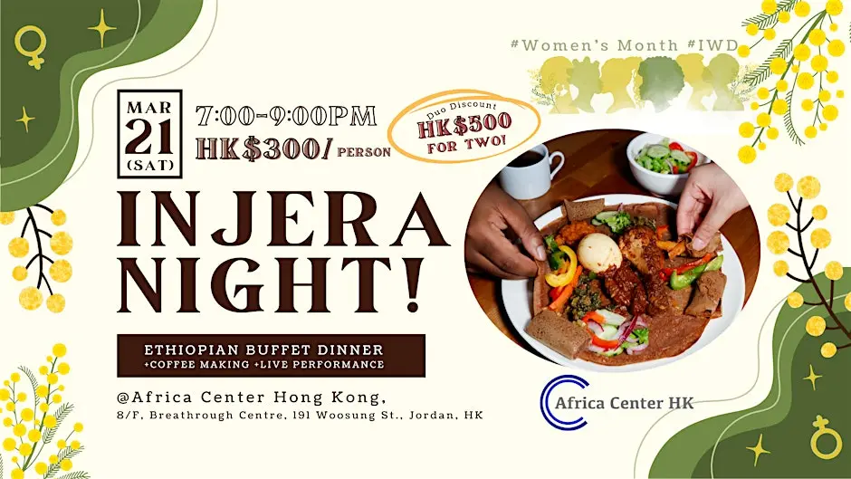 21 Mar (Sat) | 19:00-21:00 Ethiopian Buffet Dinner, Live Performance, Coffee Making Demonstration, and good vibes! Join with your friends and families to celebrate the Women’s Month!